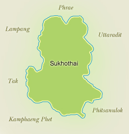 Sukhothai is a small, peaceful province located on the lower edge of the northern region of Thailand, 427 kilometres (267 miles) north of Bangkok or some 298 kilometres south of Chiang Mai. The province covers some 6,596 square kilometres and is divided into 9 Amphoes(districts): Muang Sukhothai (Sukhothai City), Ban Dan Lan Hoi, Khiri Mat, Kong Krailat, Sawankhalok, Si Nakhon, Si Samrong, Si Satchanalai and Thung Saliam.